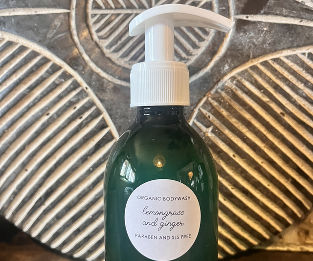 500ml or 250ml amber pump bottle of organic shower gel SLS AND PARABEN FREE INGREDIENTS CASTILL BASE WITH SWEET ALMOND OIL AND PURE ESSENTIAL OILS LEMONGRASS AND GINGER
