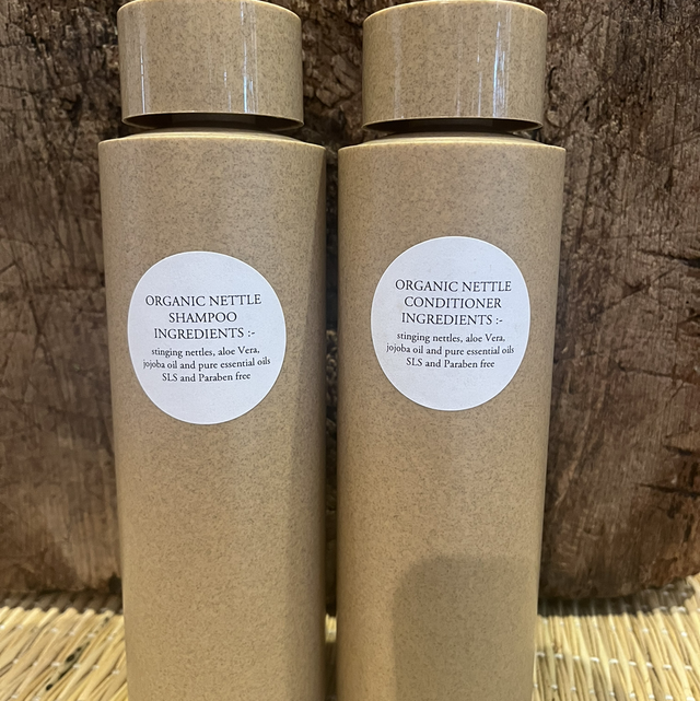 500ml organic nettle shampoo and 500ml nettle conditioner PARABEN AND SLS FREE with pure essential oil of lemongrass and glycerine, cocos nucifera ( coconut extract) potassium sorbate